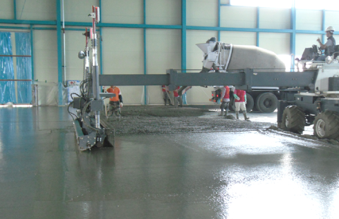사용하고 바닥의 평활도(FLATNESS)를 높이기 위하여 레이저 시스템에 의하여 자동 조절되는 LASER SCREED로 콘크리트 면을 정리한 후,