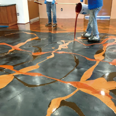 -프라이머가 완전히 경화된 것을 확인 후 스파이크 슈즈를 신고 혼합 용기가 빌 때까지 자재를 걸으면서 리본 모양으로 자재를 부어줍니다. 자재를 시공하기 전 혼합된 각각의 자재를 바닥에 자유롭게 부어 줍니다.